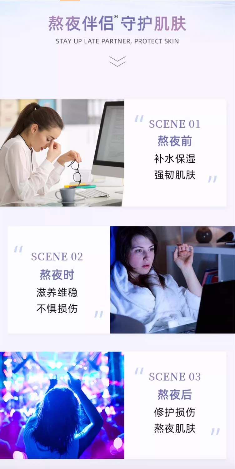 - Late-Night Repair Power: Ectoin and other active ingredients work to repair visible damage and signs of fatigue caused by late nights, such as dullness and fine lines. Clinical studies show significant improvement in skin's appearance after consistent use.